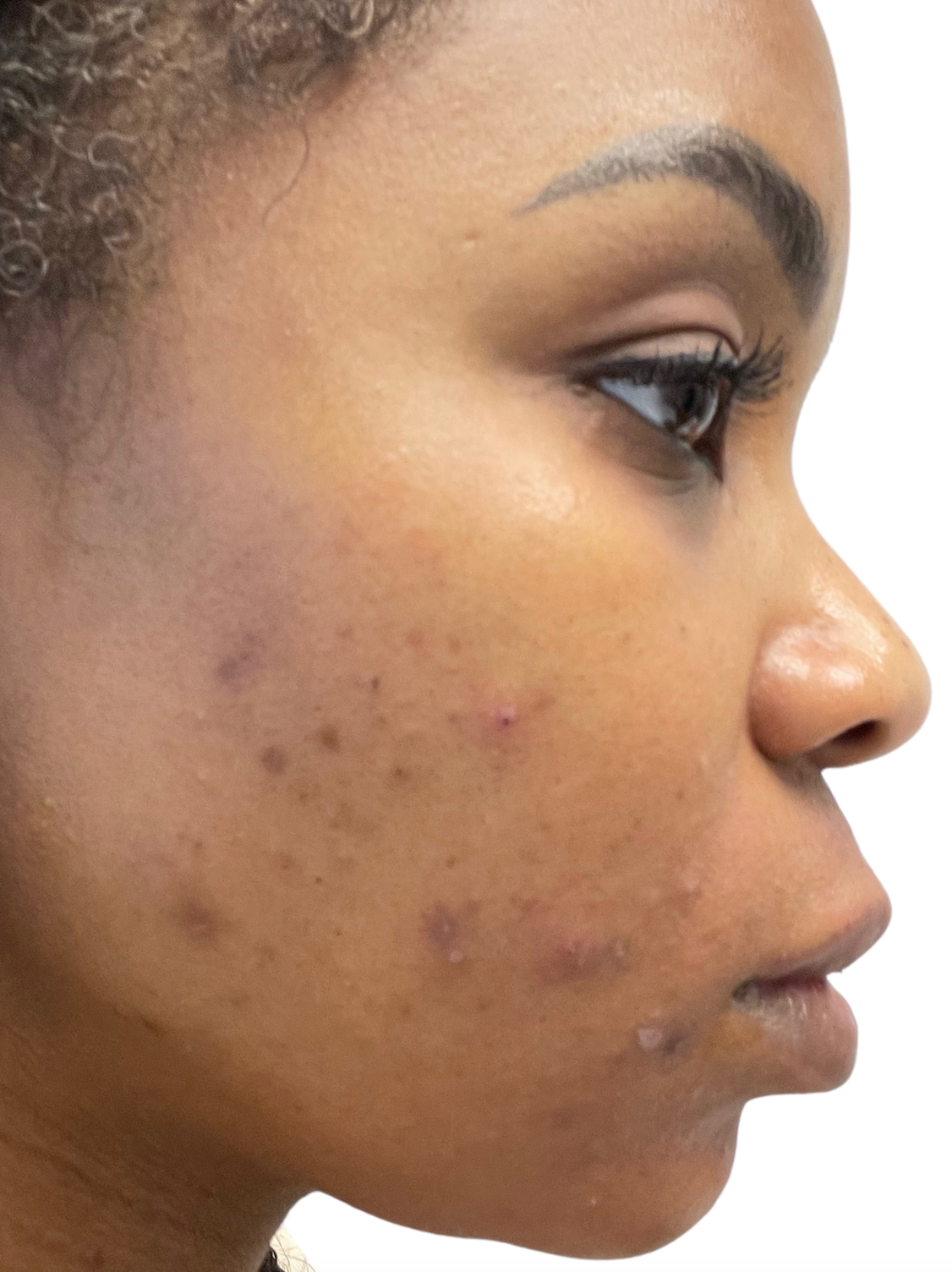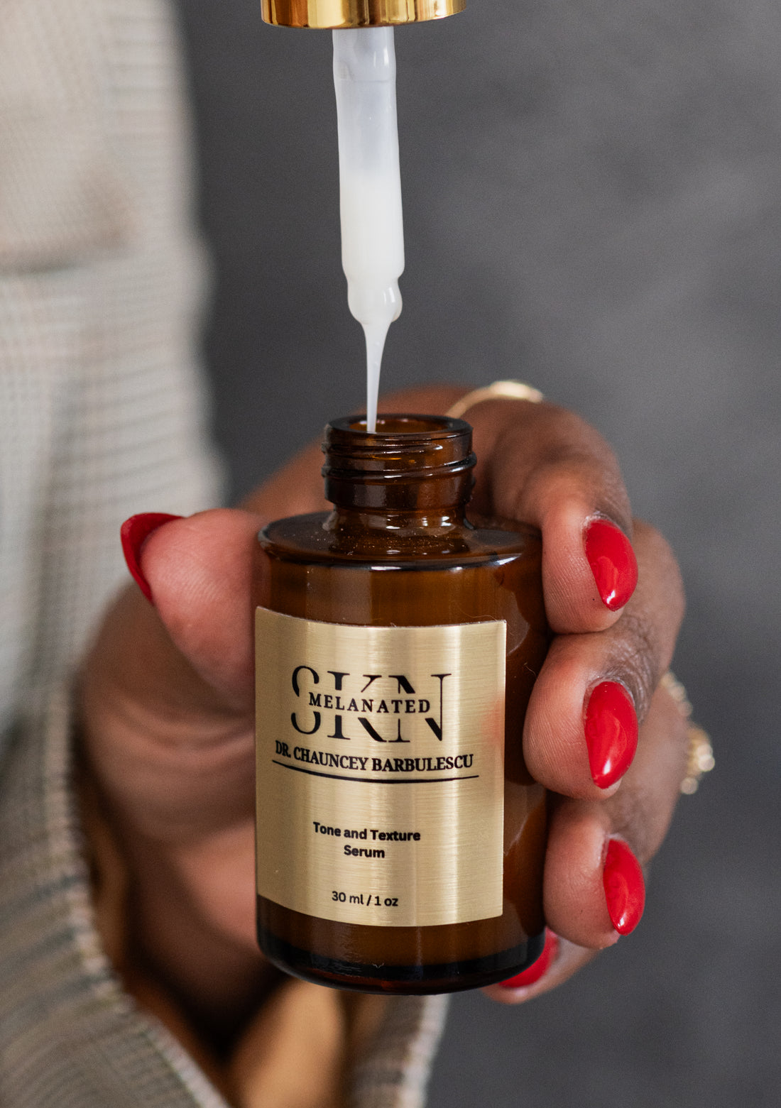 Melanated SKN tone and texture serum is a proprietary skincare formulation developed Dr. Barbulescu to address one of the most persistent and underserved concerns in dermatology: hyperpigmentation and textural irregularities in melanin-rich skin. After witnessing countless patients struggle with ineffective, irritating, or overly harsh solutions — and after experiencing those same frustrations herself — she created a product that is clinically grounded, deeply restorative, and beautifully effective for richly pigmented skin tones.